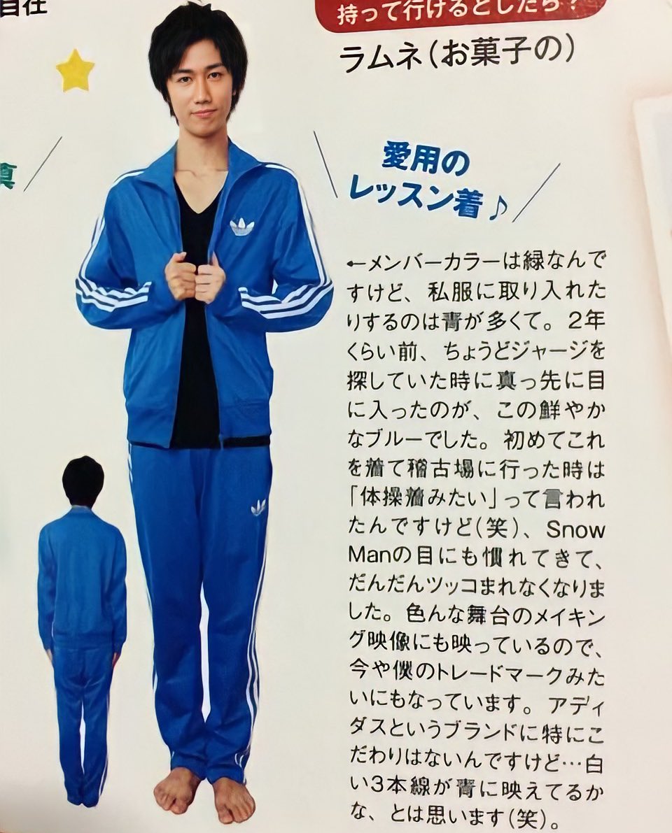 Snow Man6人時代では阿部亮平くんは青い(水色?)のジャージをレッスン着として着ていました。